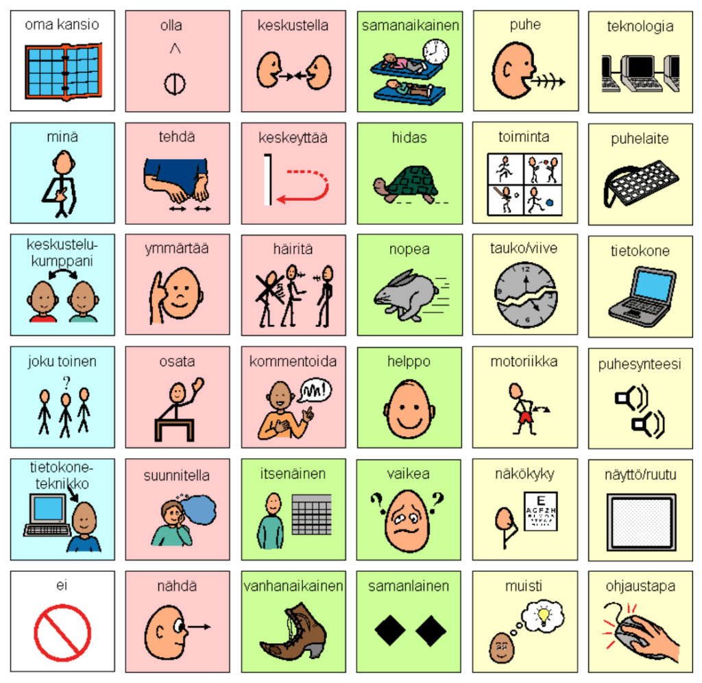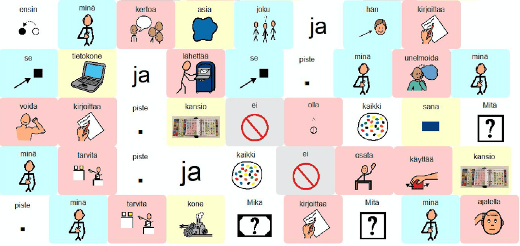 Hei Markku! Danielin käyttämässä AACi-kommunikointikansiossa on Boardmaker – nimisen tietokoneohjelman merkkejä; usein niistä puhutaan myös PCS symboleina. Ohjelmalla voi luoda erikokoisia ja sisältöisiä kommunikointitauluja aina tarpeen mukaan. Sekä AACi-kansio että Boardmaker ohjelma ovat maksullisia ja löytyvät helposti verkosta hakemalla. Ilmainen keino luoda kommunikointitauluja löytyy Papunetistä http://papunet.net/materiaalia/kuvatyokalu. Kannattaa kokeilla!