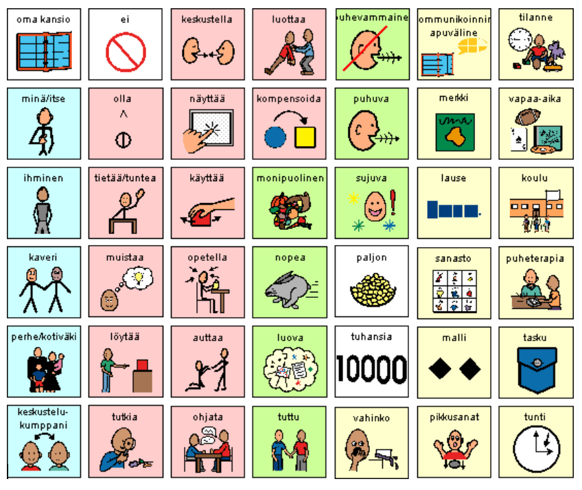 Paulalle vastaus: Toinen osapuoli ei saa aina olla tuttu henkilö, vaan ulkopuolelta tuleva henkilö tuo uusia ideoita mukanaan puhevälineen käyttäjälle. Peruskoulussa me pelasimme muistipeliä Bliss-kielisillä merkeillä. Siinä piti tehdä pari kuvasta sekä Bliss-kuvasta, jotka tarkoittavat samaa asiaa. Peruskoulussa olin harmillisesti ainoa Bliss-kielen käyttäjä, mutta osa henkilökunnasta käytti kuitenkin Bliss-kieltä.