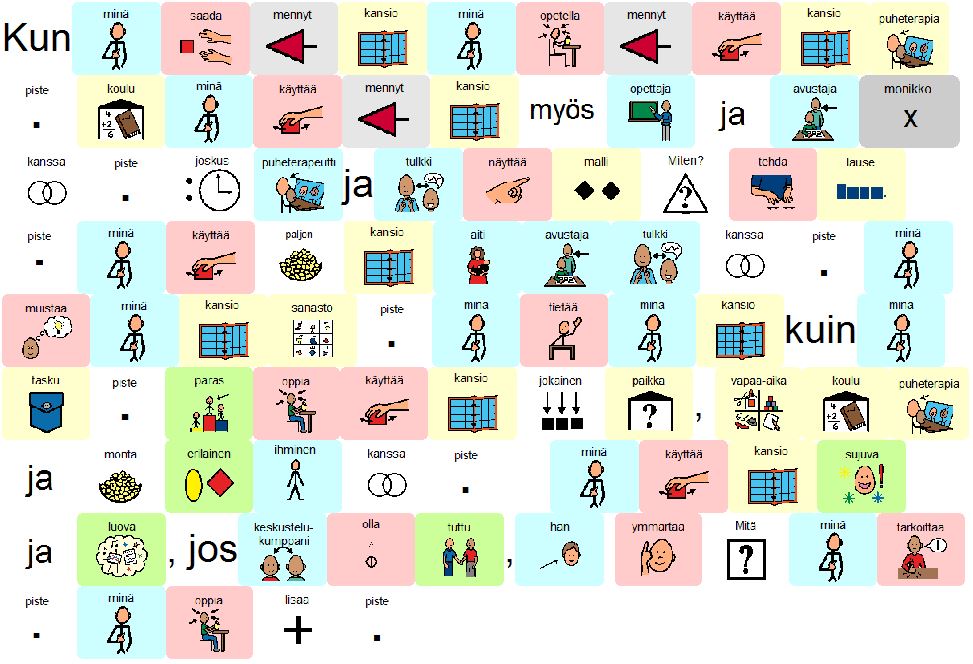 Kun minä sain kommunikointikansion, opettelin käyttämään sitä puheterapiassa. Koulussa minä käytin kansiota opettajan ja avustajien kanssa. Joskus puheterapeutti ja tulkki näyttää vieläkin mallia, miten tehdään lause.