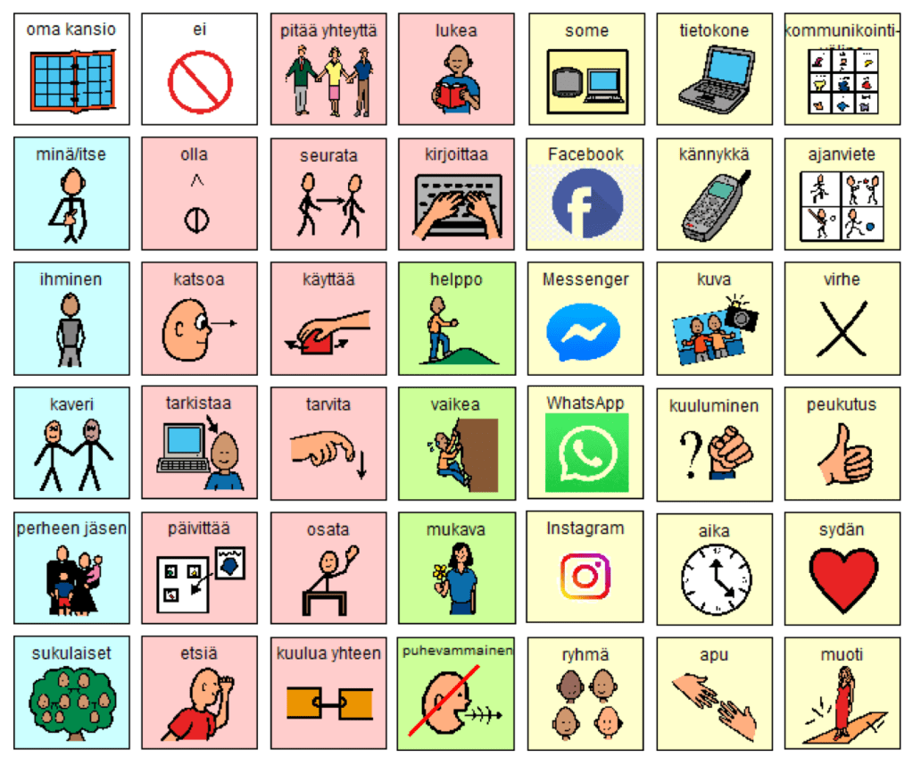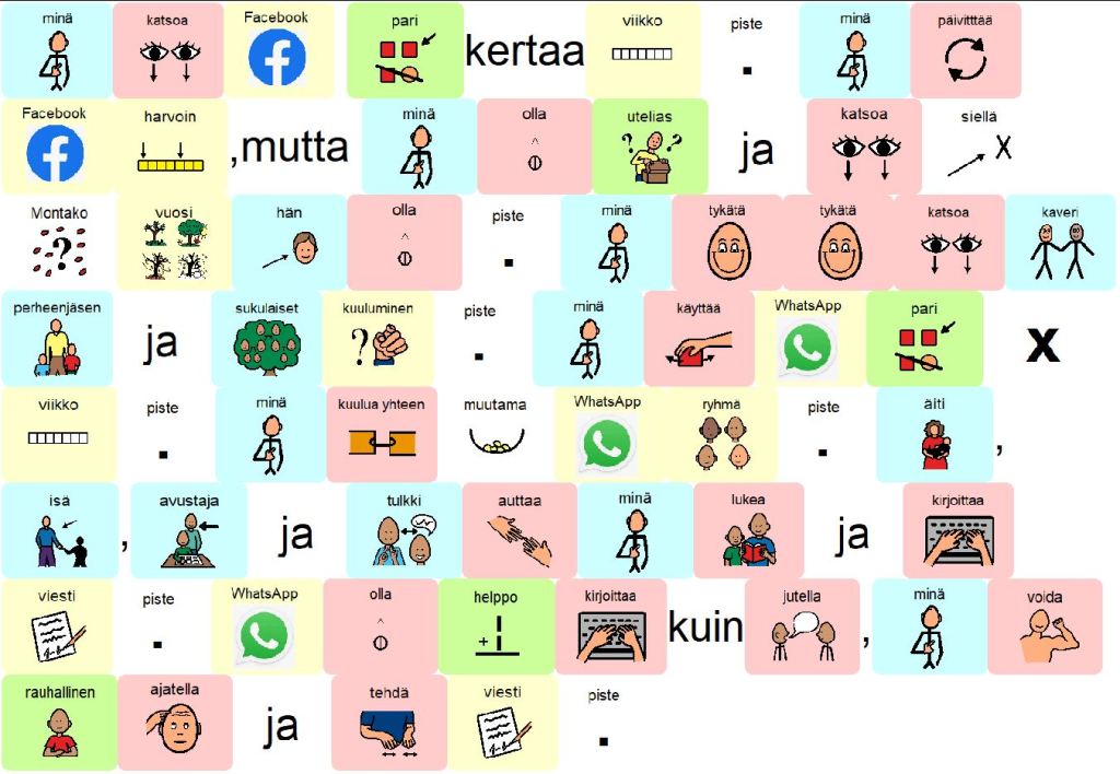 Lukihäiriön takia en pysty kirjoittamaan myöskään Facebookiin itse. Kaikkeen kirjoittamiseen tarvitsen apua. Mulla on käytössä Grid-kommunikointiohjelma ja tiedän, että siihen pystyisi lataamaan sosiaalisen median sovellukset ja laite lukisi viestit minulle ääneen. Grid-ohjelmaan tarvitsisi laittaa kuvasymboleja, joiden avulla voisin kirjoittaa tekstin sosiaaliseen mediaan. Minun Grid-ohjelma on kuitenkin vielä keskeneräinen, sillä minun pitäisi maksaa ohjelmien asennus itse. Kunta ei suostu sitä maksamaan, koska en oo enää peruskoulussa ja tartten vain sillon tällön kommunikoinnin apuvälinettä. Ohjelman muokkaus olisi isotöinen juttu. Siinä voisi kestää pari-kolme vuotta, että se pelaisi kunnolla.