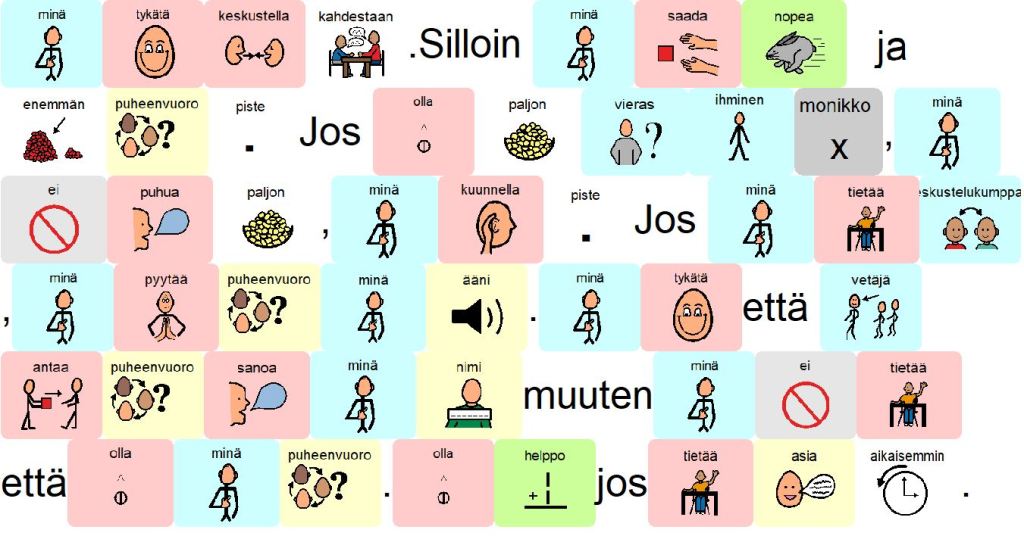 Tiettyihin ryhmätilanteisiin toki voi miettiä kommentia ja puheenvuoroa jo etukäteen kuten blogista kävi ilmi mutta vapaa massa tilanteessa äänen kuuluviin saaminen voi olla vaikeampaa, se edellyttää myös mahdolliselta tulkilta/avustajalta herkkyyttä tukea ja rohkaista puhevammaista ottamaan tilaa osallistumiseen.