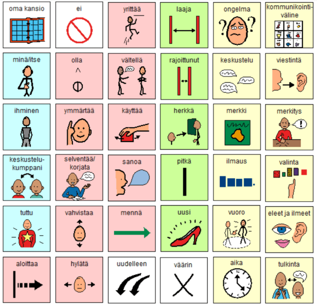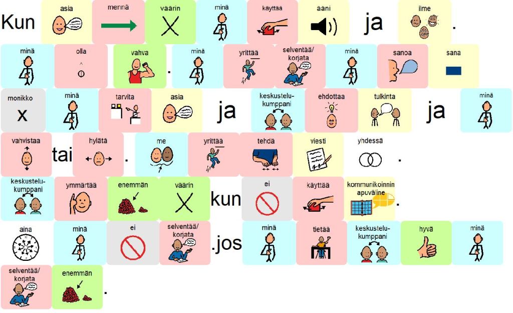 Minun puheeni on epäselvää, ja joidenkin on vaikea ymmärtää minun puhetta. Tarttee olla tuttu paikalla, silloin on helpompi. Jos joku ymmärtää minut väärin, niin sitten minä keksin toisen sanan tilalle. Joskus voin näyttää sanaa vastaavaa esinettä, sanoa ”samanlainen sana kuin tuo” ja silloin mun tuttu keksii sanan. Välillä etsin sanan bliss-kansiosta tai Gridin kommunikointisovelluksesta koneelta.